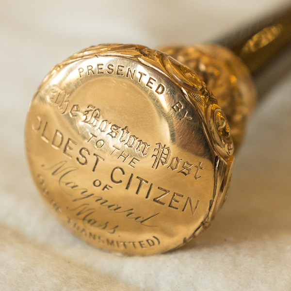 This Boston Post Cane is from Maynard, Massachusetts. The canes were sent out to each town’s Board of Selectmen, who were to identify the oldest man in town and present the cane to him, with appropriate pomp. At first, this was seen as a great honor, but problems loomed. Several recipients’ families though that the cane was a gift and belonged to his survivors, despite the words “TO BE TRANSMITTED” engraved on the knob. The cane was supposed to be returned to the Select Board for reassignment, and this lead to some uncomfortable situations in many towns.