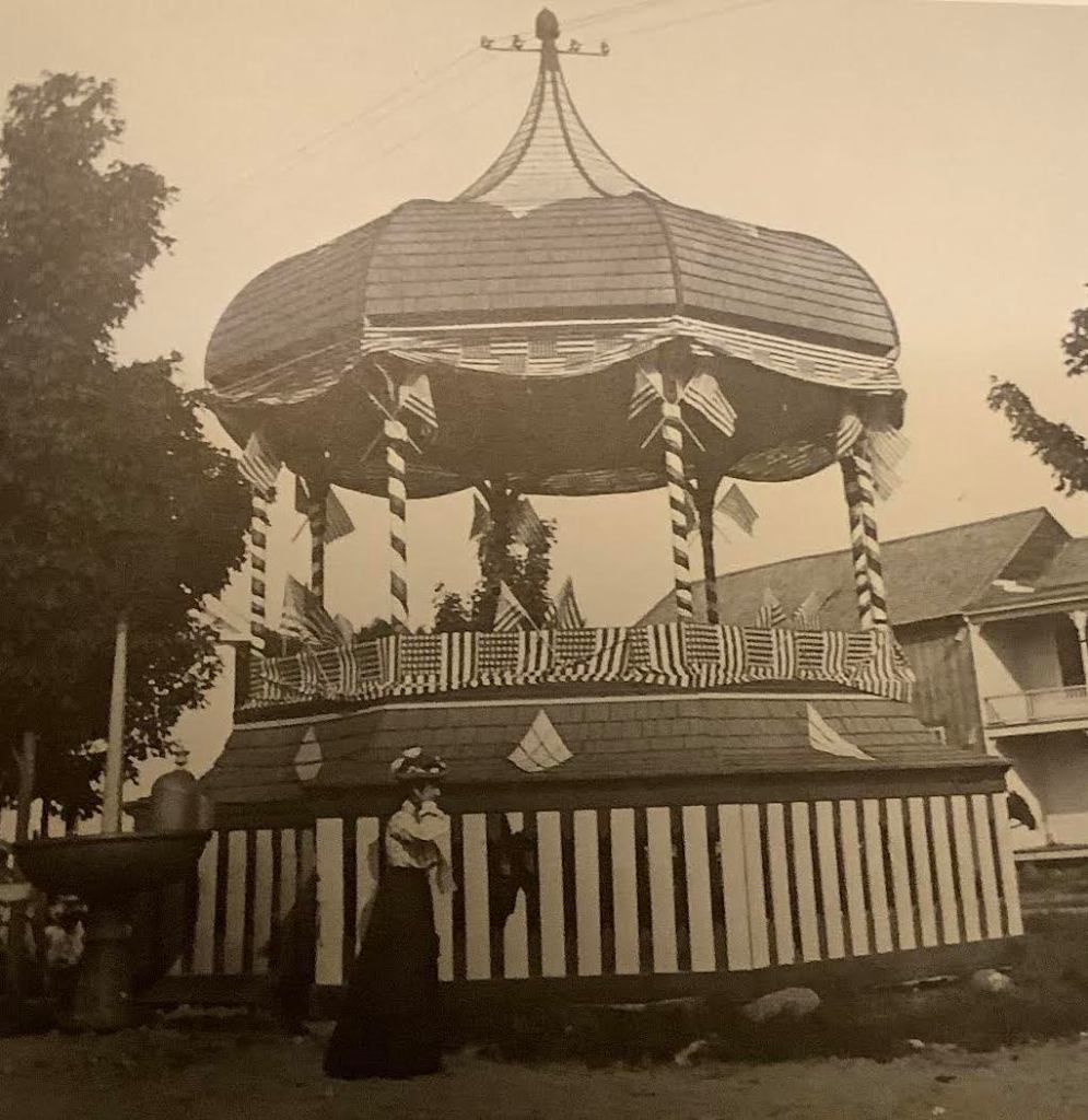 On the Common of many towns in New Hampshire there stands a recognizable structure. It is round or hexagonal or octagonal; it is elevated above ground, reached by several steps; it is roofed but is open to the air on all sides; there is a railing around the edge. What is it? It is a Band Stand. Or is it a Gazebo??