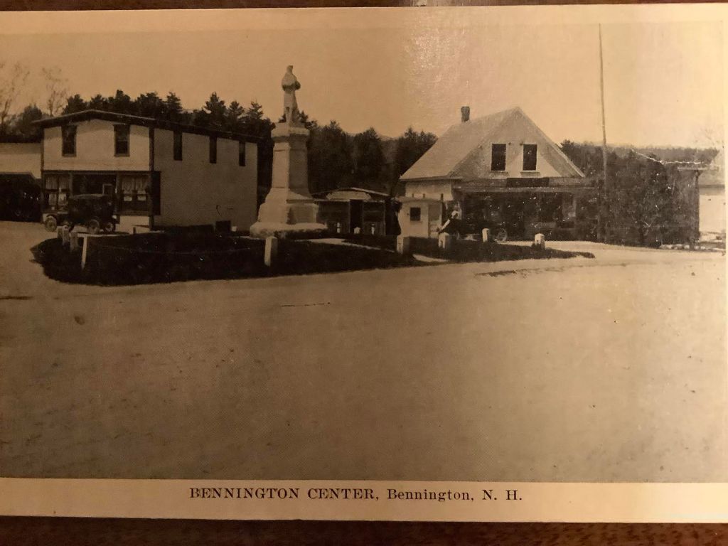 Bennington began as settlements along the Contoocook River, next to the Great Falls. As the town grew, the center of the village became the intersection of two State-owned roads: 2nd New Hampshire Turnpike, [aka: Route 31] linking the town to Greenfield and Hillsboro; Route 47, linking the town to Francestown; and Hancock Road, heading South then West to Hancock on Route 137. Also: Mill Road/Antrim Road, past the Paper Mill toward Antrim; and Old Greenfield Road, going South out of town toward Greenfield and Peterborough. In other words, Bennington was a major cross-roads — odd, especially when you think that the population was less than 700 people!