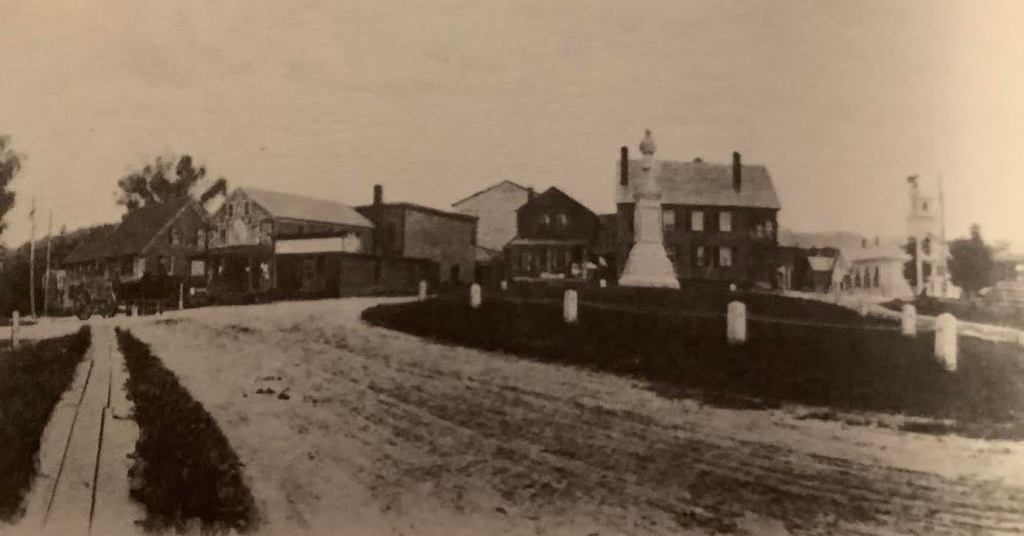 In this view of the town center, we can see the wooden sidewalk on the left, running North. Just behind the horse and wagon at the end of the sidewalk, we see the Crystal Spring House. To the right of it is Joslin’s Store, with its colorful facade. The large house with two chimneys behind the Civil War Monument is the Adams Hotel, and the white building in the upper right is the Congregational Church.